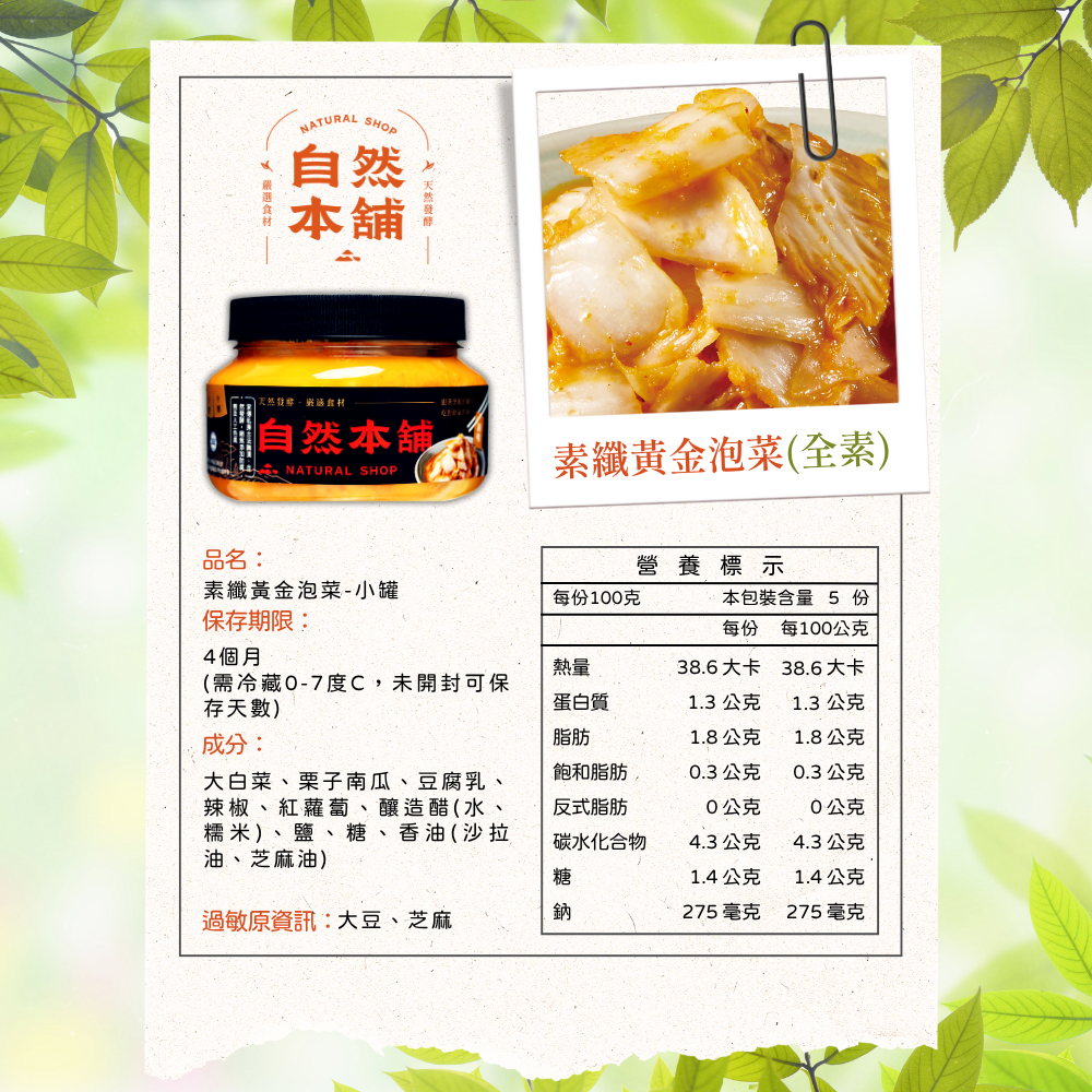產品成分 : 大白菜、栗子南瓜、豆腐乳、蒜仁、辣椒、紅蘿蔔、釀造醋(水、糯米)、鹽、糖、香油(沙拉油、芝麻油)