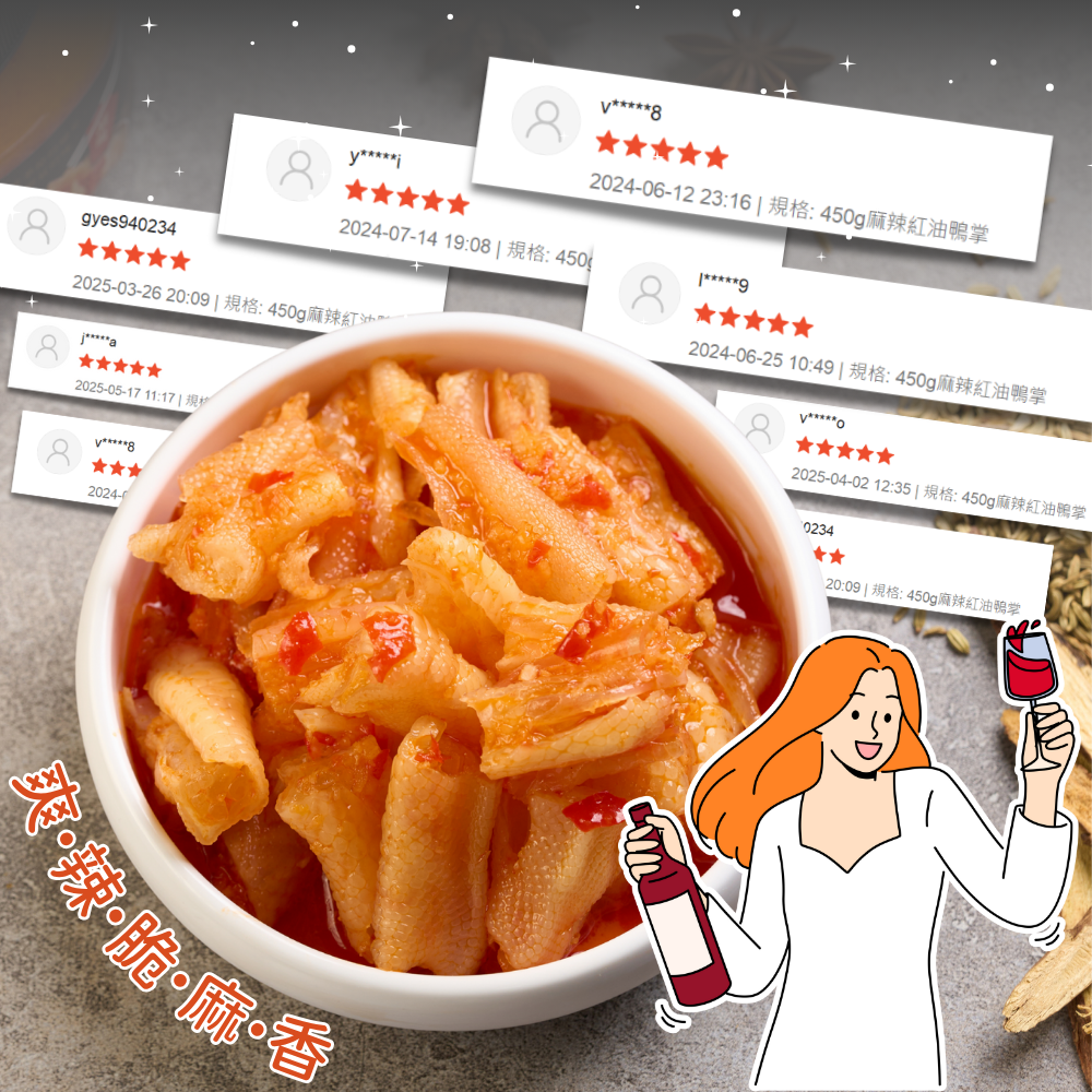 產品成分 : 鴨掌、三櫻椒、蒜頭、辣椒、釀造醋、菜籽油、辛香料(八角、月桂葉)、芝麻、花椒、鹽、糖