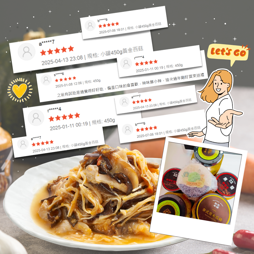 產品成分 : 杏鮑菇、秀珍菇、金針菇、黑木耳、蒜仁、辣椒、紅蘿蔔、釀造醋(水、糯米)、鹽、糖、栗子南瓜、豆腐乳、香油(沙拉油、芝麻油)
