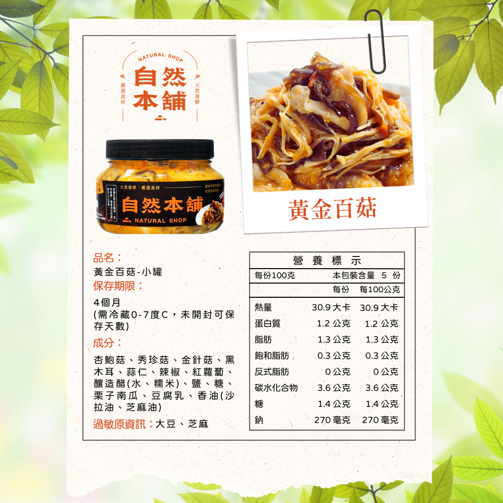 產品成分 : 杏鮑菇、秀珍菇、金針菇、黑木耳、蒜仁、辣椒、紅蘿蔔、釀造醋(水、糯米)、鹽、糖、栗子南瓜、豆腐乳、香油(沙拉油、芝麻油)
