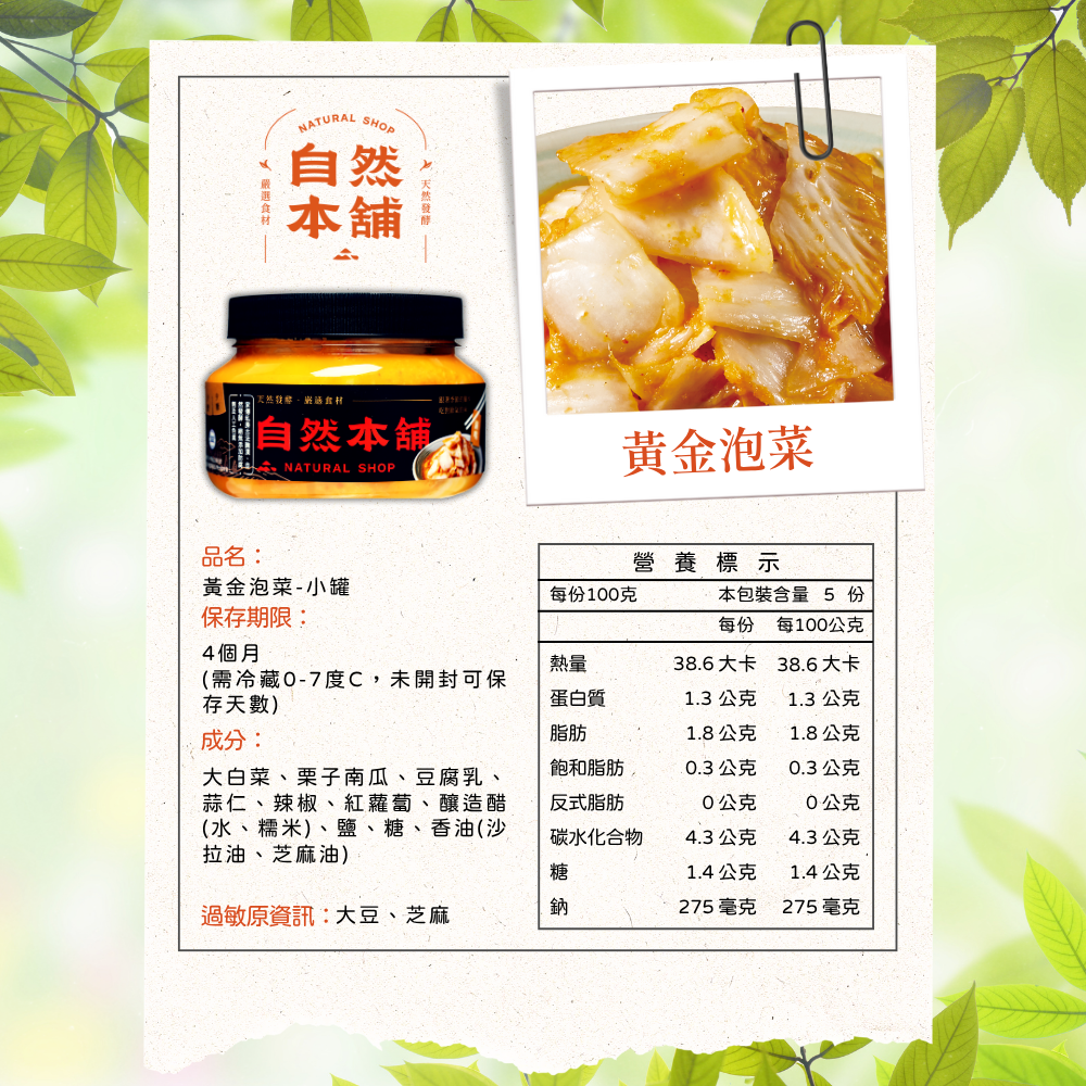 產品成分 : 大白菜、栗子南瓜、豆腐乳、蒜仁、辣椒、紅蘿蔔、釀造醋(水、糯米)、鹽、糖、香油(沙拉油、芝麻油)