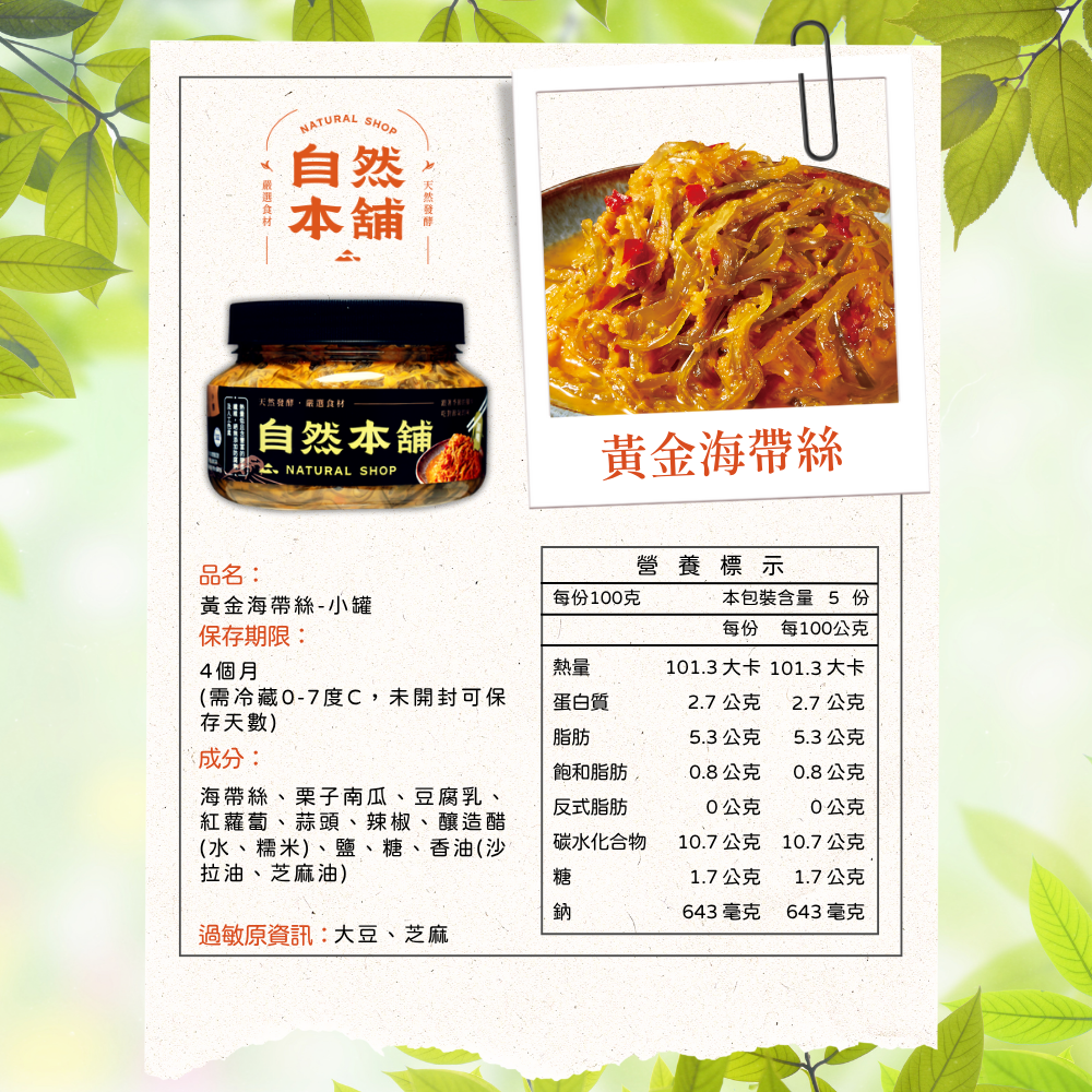 產品成分 : 海帶絲、紅蘿蔔、栗子南瓜、蒜頭、辣椒、釀造醋(水、糯米)、鹽、糖、香油(沙拉油、芝麻油)